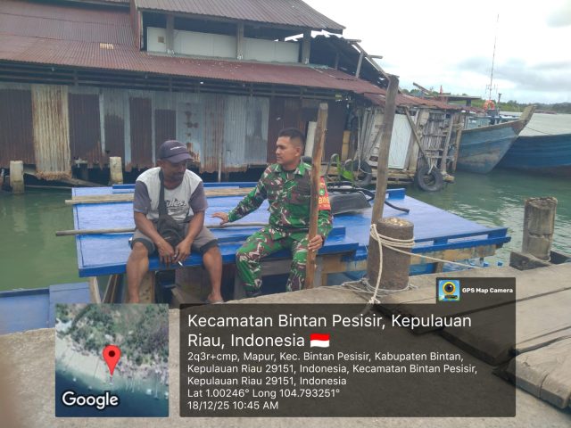 BINTAN— Personel Koramil 02/Bintan Timur (Bintim), Sertu Indra Yuriko selaku Babinsa Desa Mapur, Kecamatan Bintan Pesisir, Kabupaten Bintan, melaksanakan komunikasi sosial (komsos) bersama nelayan setempat, Kamis (18/12/2025) pagi.
