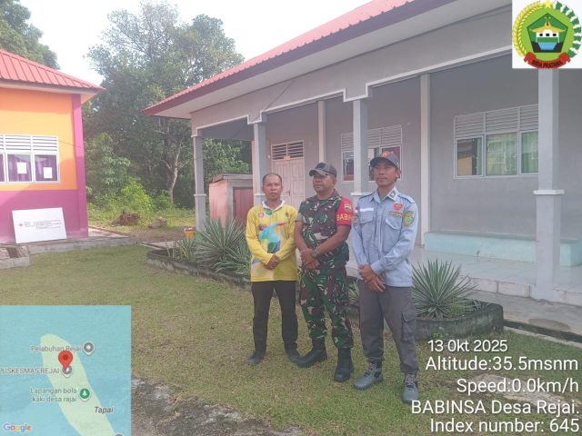 LINGGA — Personel Koramil 06/Senayang, Peltu Jani S. Sembiring yang bertugas sebagai Babinsa Desa Rejai, Kecamatan Bakung Serumpun, Kabupaten Lingga, melaksanakan kegiatan patroli sistem keamanan keliling (Siskamling) bersama komponen masyarakat di lingkungan SMA Negeri 1 Desa Rejai, Senin (13/10/2025).
