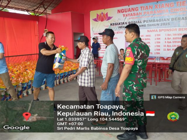 BINTAN – Babinsa Desa Toapaya Koramil 02/Bintim, Sertu Pedri Marlis, melaksanakan monitoring dan pengamanan kegiatan sosial pembagian beras kepada masyarakat Desa Toapaya, Kecamatan Toapaya, Kabupaten Bintan, Minggu (1/2/2026).