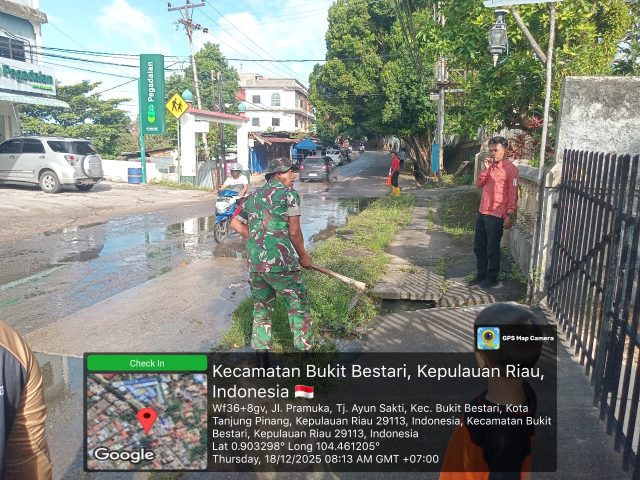 TANJUNGPINANG – Babinsa Kelurahan Tanjung Ayun Sakti, Kopda Nuriono, bersama pihak kelurahan dan masyarakat melaksanakan kegiatan gotong royong di Jalan Pramuka, Kamis (18/12/2025).