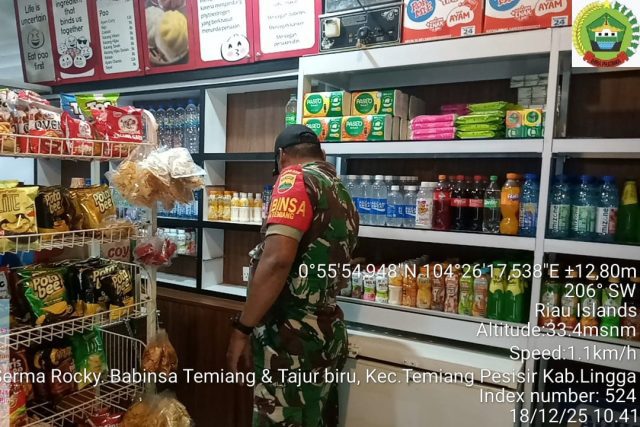 LINGGA – Babinsa Kecamatan Temiang Pesisir, Serma Roky, melaksanakan kegiatan Komunikasi Sosial (Komsos) dan Pembinaan Teritorial (Binter) dengan para pedagang di wilayah Temiang Pesisir, Kamis (18/12/2025).