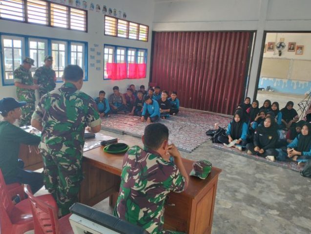 TAMBELAN — Komandan Koramil (Danramil) 07/Tambelan, Lettu Inf Amsizal, bersama Batituud Peltu M Hasanuddin memberikan sosialisasi terkait penerimaan prajurit TNI kepada para pelajar SMAN 1 Tambelan yang berlokasi di Desa Kukup, Kecamatan Tambelan.