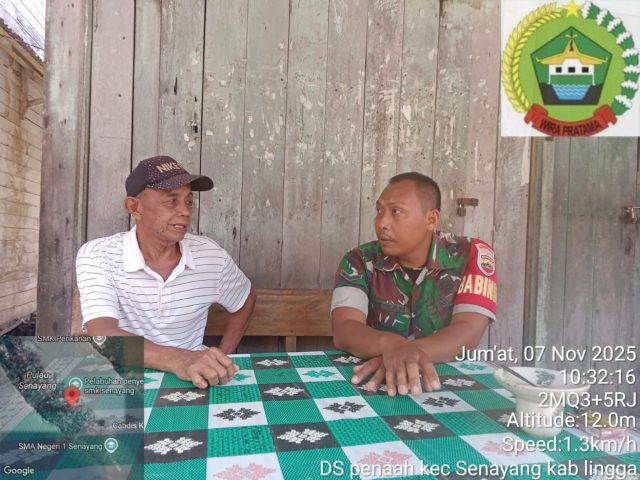 LINGGA – Babinsa Desa Penaah, Kecamatan Senayang, Kabupaten Lingga, Serda Eman, melaksanakan kegiatan komunikasi sosial (komsos) bersama warga setempat, Jumat (7/11/2025).